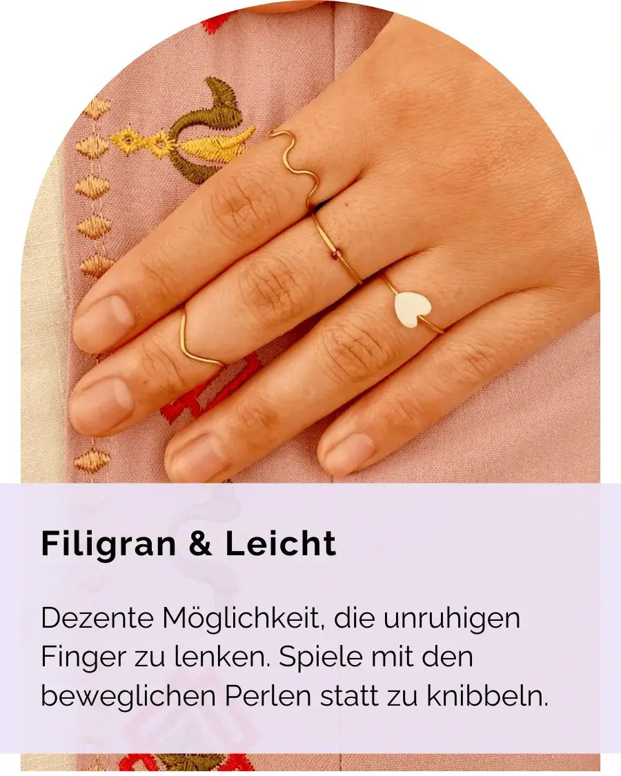 Für alle, die an ihrer Finger knibbeln oder ihre Fingernägel kauen, können Anxiety Ringe eine alternative Beschäftigung der unruhigen Finger bieten. Die sensorische Stimulation des Anxiety Rings, sei es durch das Drehen, Bewegen oder Berühren der Perlen, kann die Aufmerksamkeit umlenken und die Hände sanft beschäftigen.